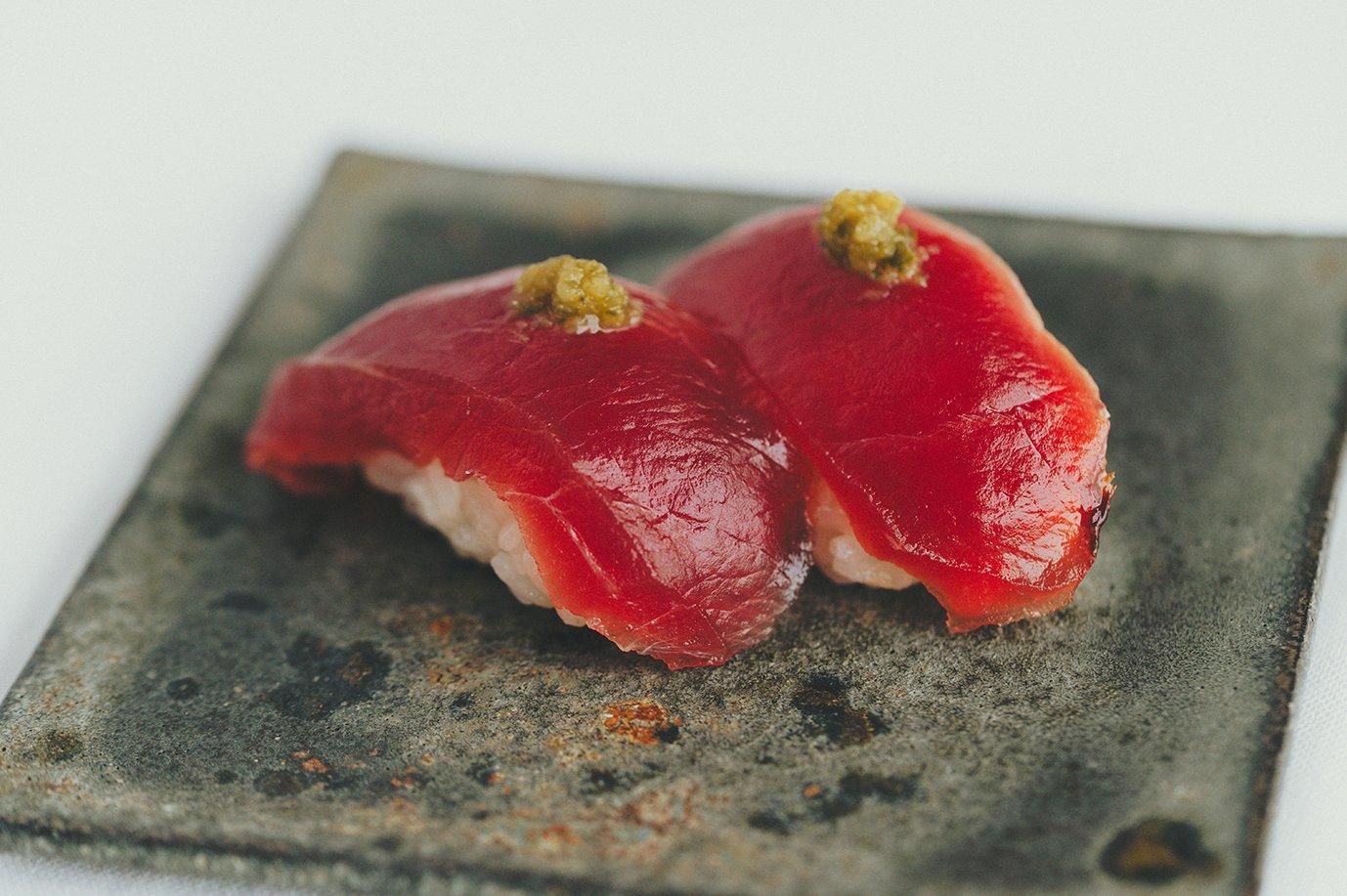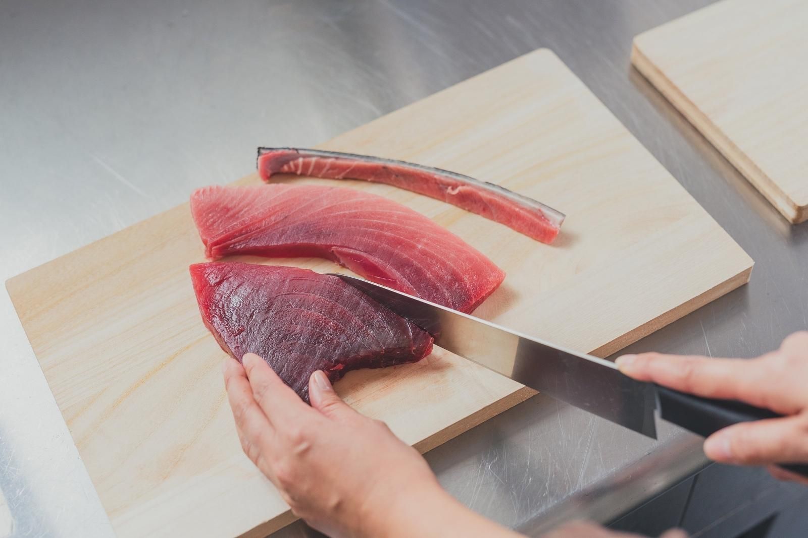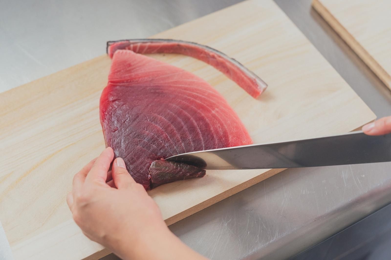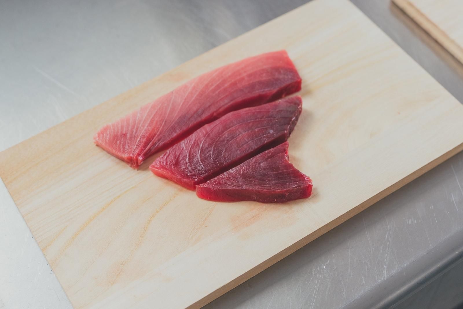 お好みの幅や、赤身中とろの部位で切り分けます。
