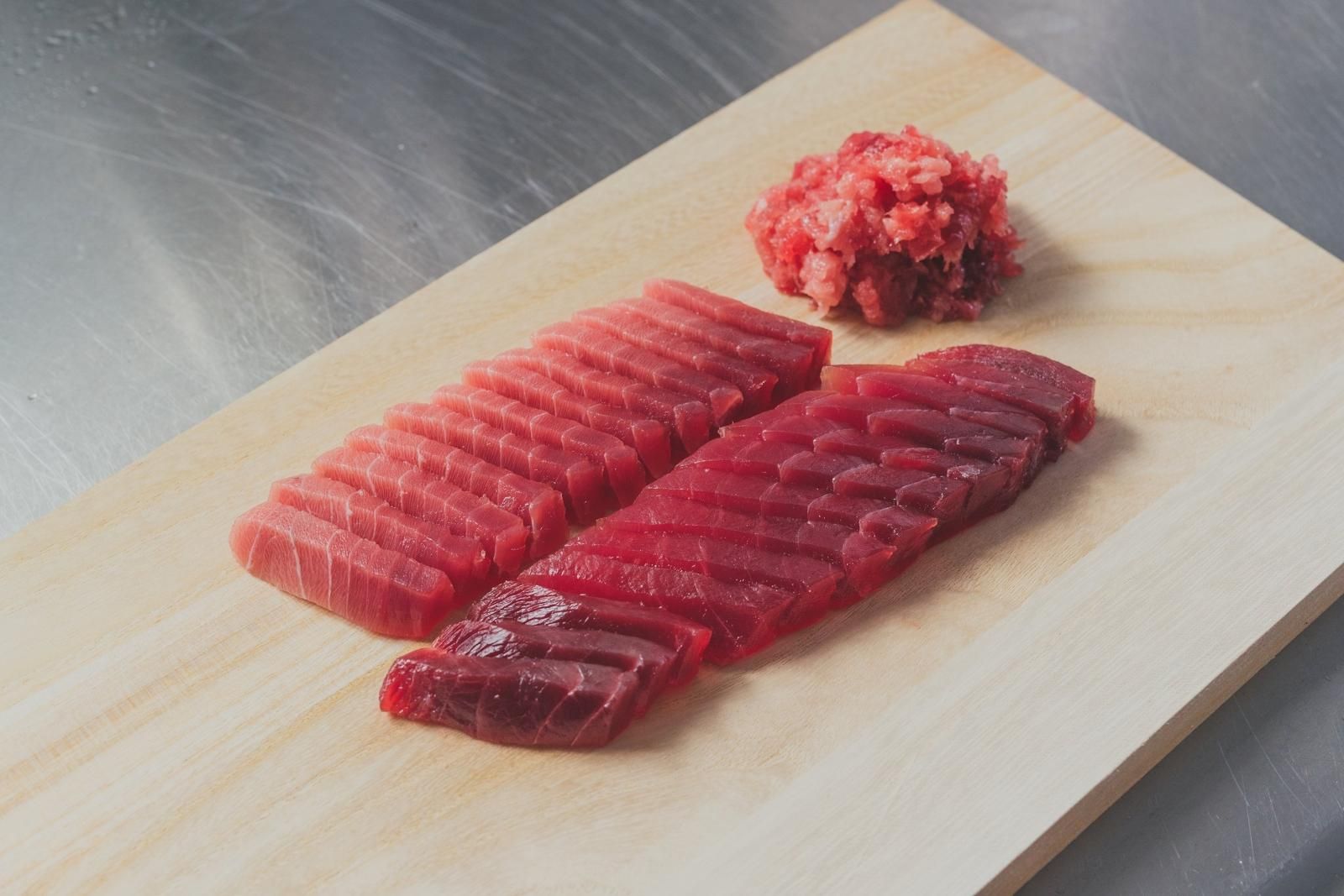 まぐろのスジを断ち切るように垂直に包丁を入れて切り付けをします。スジの多い部分は叩いてネギトロに、端の部分はブツ切りに。