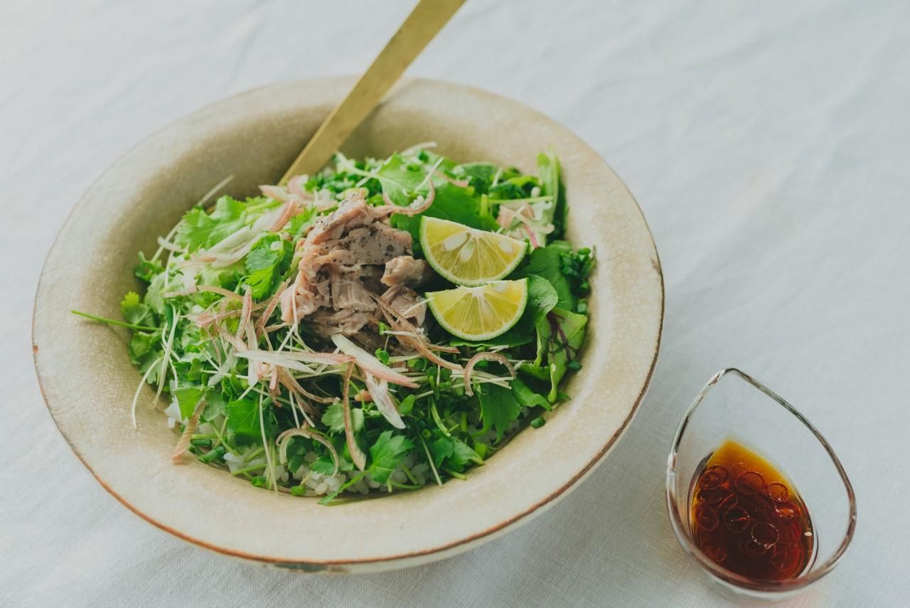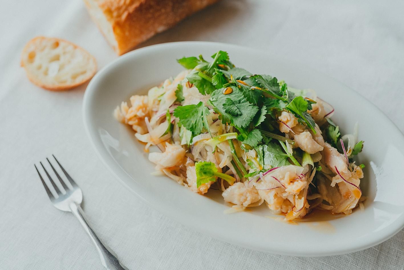 "まぐろ屋さんのサラダ・フィッシュ" かじきコンフィは、ごま油の香ばしい風味とレモンの爽やかな香りがマッチし、サラダのようにお召し上がりいただける一品です。