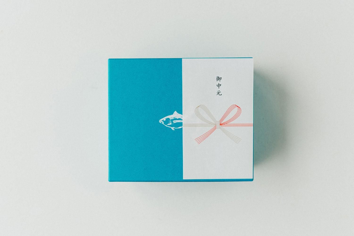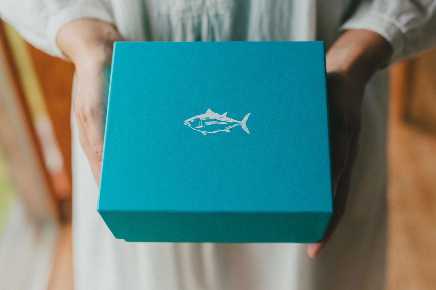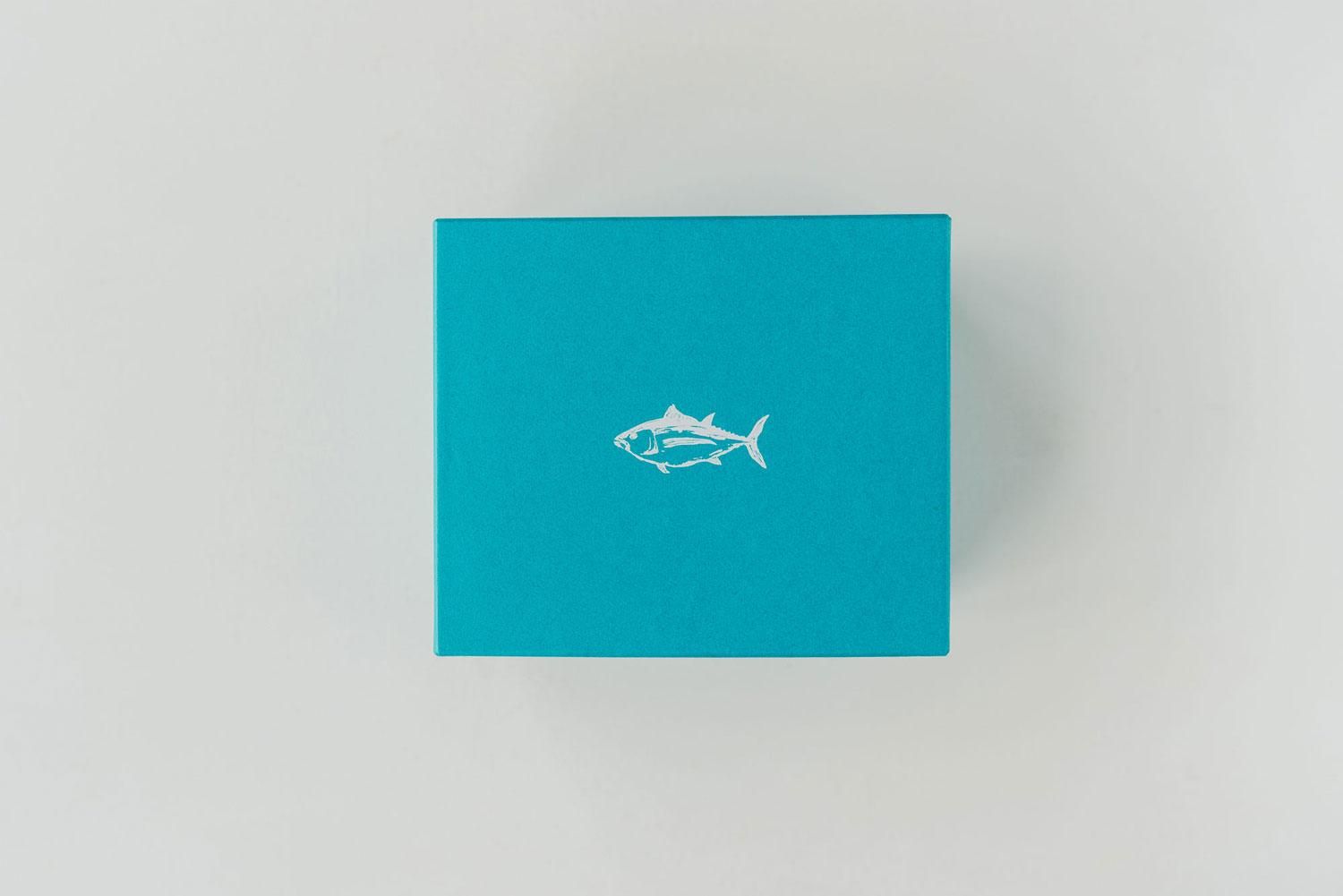 エメラルド色の化粧箱にまぐろロゴがシルバーで箔押しされた、FISHSTANDオリジナルのボックスに入れてお届けします。